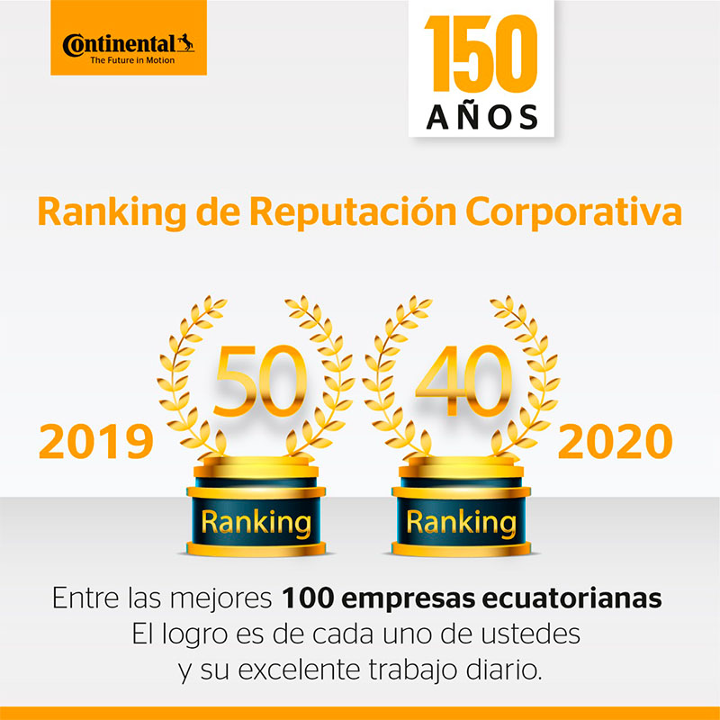 Nos encontramos dentro de las mejores 100 empresas ecuatorianas y dentro del top 5, en segundo lugar, valorado por la mejor reputación para analistas financieros. Aplaudimos y sentimos orgullo al ver posicionada a nuestra empresa Continental Tire Andina entre las mejores empresas con mejor reputación corporativa en el país. Los resultados del Monitoreo Empresarial de Reputación Corporativa se basan en una encuesta a grupos de expertos y consumidores con un total de 2.594 encuestas. Los grupos y fuentes consultados fueron directivos, analistas financieros, periodistas económicos, ONG´s, Sindicatos, expertos en sistemas de gestión, catedráticos del área de empresa, merco digital, consumidores y evaluación de méritos mediante indicadores objetivos.